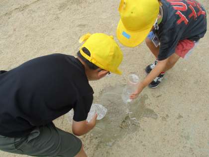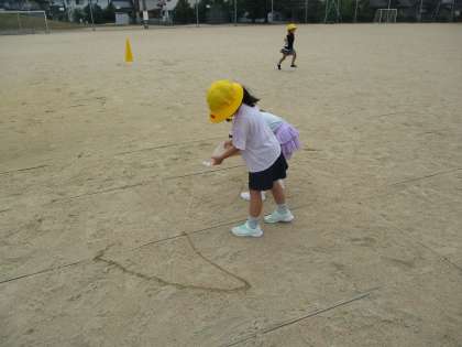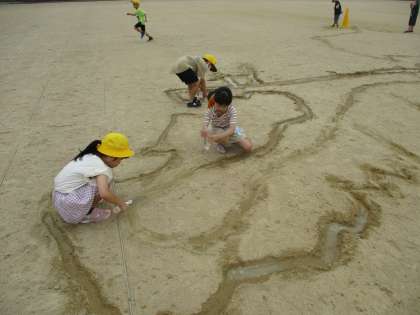 生活科では、グラウンドに水で絵を描いたり、水たまりをつくったりしました。自分たちで遊び方を工夫しながら、水といっぱい触れ合いました。