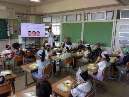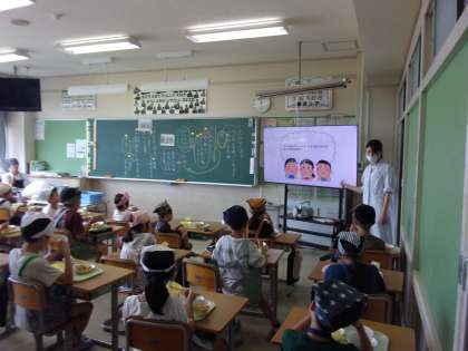 今日は、栄養教諭が日々の給食で意識してほしいことを「しらす丼」という絵本で伝えてくださいました。子供たちは、「いただきます」の意味を含めて、食べることの大切さやありがたさについて学びました。早速、ご飯を一粒を残さず食べたり、食器を丁寧に戻したりする姿が見られました。