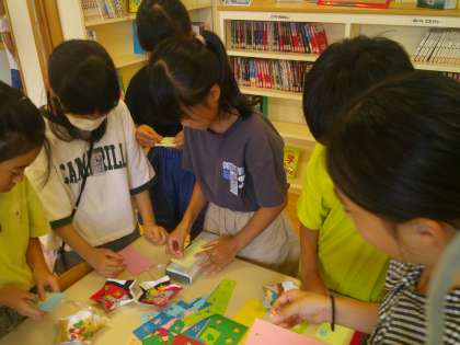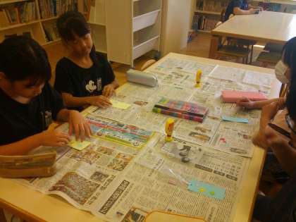 休み時間に、図書室でしおりを作りました。子供たちは、デザインや色のバランスを友達と一緒に考えながら、楽しんで活動に取り組んでいました。