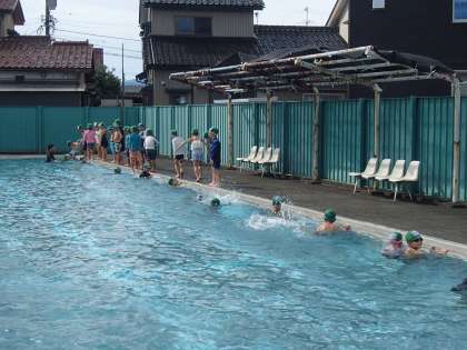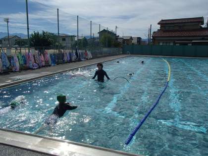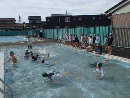 「みずあそび」も、今日で最後になりました。長い距離を泳ぐことに挑戦するグループ、泳げるようになることを目指すグループ、水に慣れて顔をつけたり息継ぎしたりすることを目指すグループに分かれて学習しました。たっぷりと活動し、できることが増えた子供たちは、大満足の様子でした。