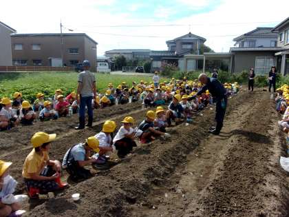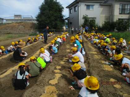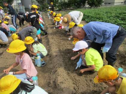 今日、大根の種を畑にまきました。先週、夏野菜の片付けをしてきれいになった畑に、栽培ボランティアの方の協力のもと、長い畝をつくりました。その畝に、一人6個の種を3個と3個に分けて穴に並べ、慎重に土をかけてから水をまきました。これからの成長が楽しみです。