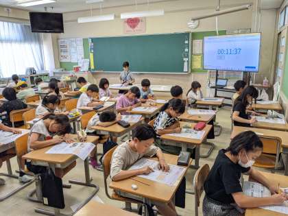 1組は音楽で、リズムに合わせてリコーダーを演奏しました。2組は、新出漢字を学習しました。3組は、工場のことについて教科書で学習したことと校外学習で工場を見学したことを生かしてテストをしました。