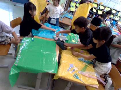 ひらひらゆれた飾りを付けた自分だけの服を作りました。自分の好きな絵だけではなく、国語科で学習した「やくそく」に出てくるアオムシを描いたり、学習発表会で演奏する楽器を描いたりしていました。世界にたった一つしかないひらひらゆれる服を、工夫しながら楽しく制作することができました。