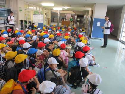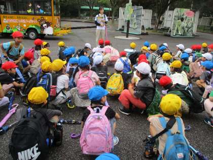 今日は、1年生108名全員がそろってファミリーパークに行くことができました。「ともだちとわくわく」「いきものとわくわく」を合い言葉に出発しました。ファミリーパークに到着し、約束について確認し、クイズラリーへ向かいました。