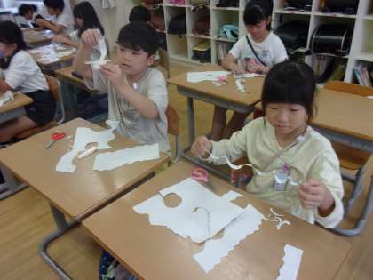図画工作科「はさみのあーと」の学習では、紙をジグザグ切ったり、細かく切ったりすると様々な形が生まれることが分かりました。切った紙を見て、「何に見えるかな。」と想像を膨らませながら、作品づくに取り組んでいました。