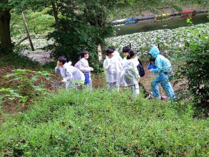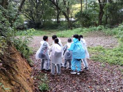小雨ですが、かっぱを着て出発しました。地図を見ながら、ポイントを探し、動物クイズに挑戦中です。