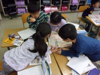 社会科の学習では、商品がどのようにして売られているのか、写真やチラシを見ながらお店の工夫を探しています。また、各自が持ち寄ったお店のチラシを見て、食材の産地を調べました。