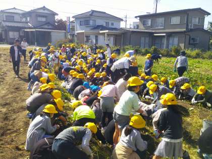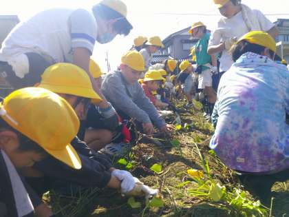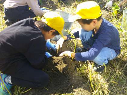異学年交流の一環として、3年生とサツマイモ掘りを行いました。昨年は助けてもらう立場だった子供たちが、今年は進んで3年生と協力しながらサツマイモを掘る姿に成長を感じました。