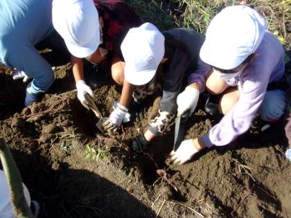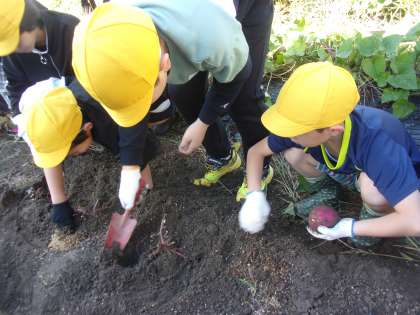 栽培ボランティアの方のご協力のもと、6年生と一緒にサツマイモ掘りを行いました。6年生に教えてもらったところを掘ってみると、たくさんのサツマイモを見付けることができました。収穫したサツマイモをどんな風に食べたいか話しながら、うれしそうに家に持ち帰りました。