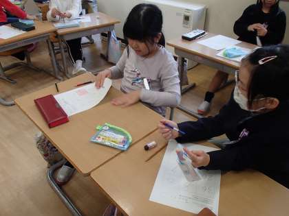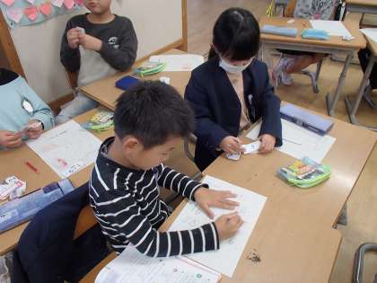 算数科の学習で、3の段と4の段の九九を使って九九ビンゴを行いました。ペアの人と引いた九九カードを読み上げて、答えが合っていたらカードに印を付けました。九九を唱える練習の成果が出て、答えをすばやく言うことができる子供たちが増えてきました。