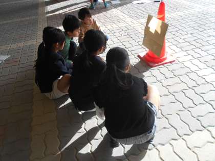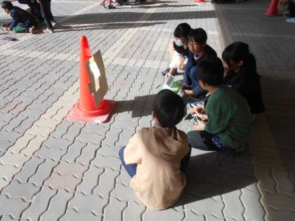 理科の学習では、鏡ではね返した日光について調べています。鏡や温度計の扱いに気を付けながら、鏡ではね返した日光を当てる前と、当てた後の温度の違いを調べました。