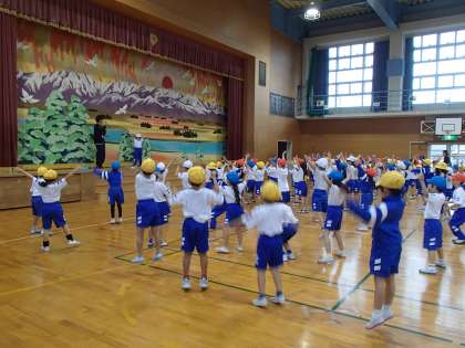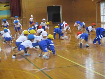 体育では、表現運動に取り組んでいます。前半は、手、足、頭、指、身体全体を使って、先生の動きを真似たり、リズムに乗って動いたりしました。後半は、体育館全体を使って動きながら、いろいろな動物に変身したり、変身したものになりきって動きを工夫したりしました。