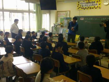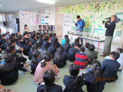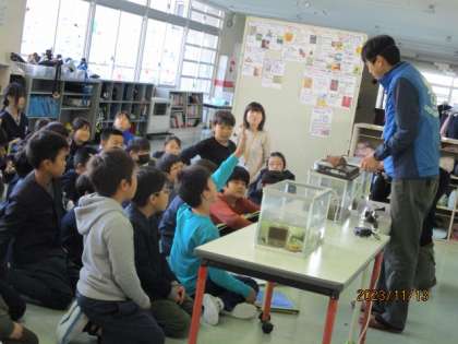 今日は、魚津水族館の学芸員さんを講師にお招きしました。子供たちは、「魚にとって過ごしやすい環境とは、どのようなものですか」「飼育する際は、川の水をくんでくるべきですか。それともカルキ抜きした水道水を使うべきですか」など、水生生物を飼育したり、調べたりする中で疑問に思ったことを、積極的に質問していました。