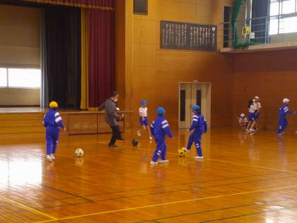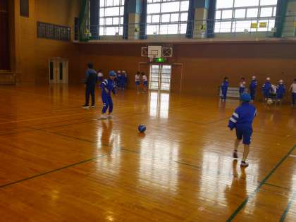 体育科「グリッドサッカー」の学習では、試合に向けてパス練習を行いました。「◯◯さんいくよ」「ヘイ!パス!」と元気のよいかけ声が、体育館中に飛び交っていました。