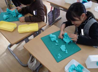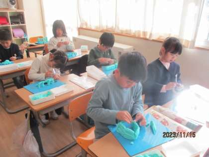 図画工作科「おもいでをかたちに」の学習では、楽しかったことやがんばったことなどを粘土で形にして表現しました。友達と休み時間にしたドッジボールのこと、チームのみんなと協力して跳んだ8の字跳びのこと等、様々な思い出を表現しました。