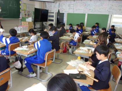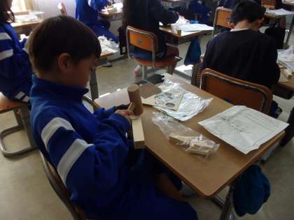 図画工作科の学習では、金づちと釘を使って作品を作っています。たくさんの釘を打ち、「次はどうしようか」「ここに打ってみよう」と想像を膨らませながら作品を制作しています。
