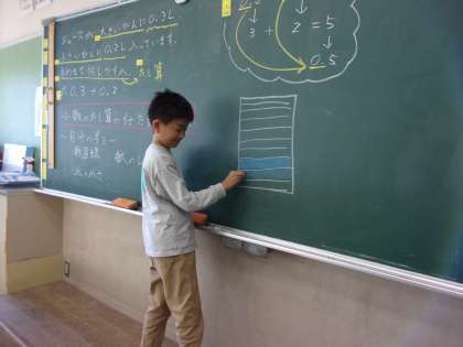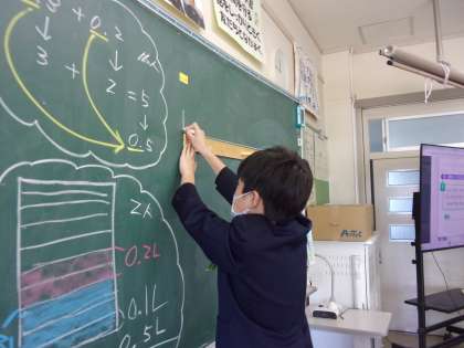 算数科では、小数の計算を学習しています。子供たちは、これまでに学習した数直線や水のかさ、数のしくみ等の様々な視点から答え方を考えました。