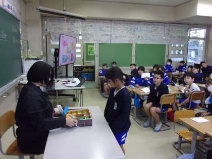 今日は、イベントのときに友達や家族に渡すグリーティングカードをつくりました。先生に、自分のほしい色・形・数を英語で伝えてカードをもらい、言葉や絵を工夫したオリジナルのカードが完成しました。
