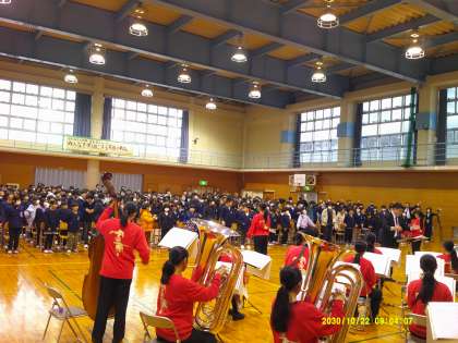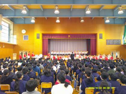 富山商業高校吹奏楽部の演奏を聴きました。演奏が始まると、迫力のある演奏や美しいたたずまいに魅了されました。「きときとの夢」の演奏では、一緒にダンスを踊って楽しいひとときを過ごしました。アンコール曲には、本校児童も演奏に加わって合同演奏を行いました。