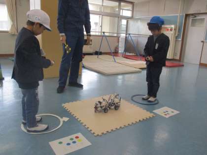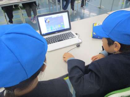 今日は、2組、4組がプログラミング学習をしました。友達と教え合いながら、思い通りにロボットを動かすためにはどうしたらよいかを、よく考えていました。