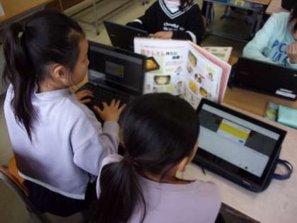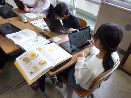 国語科の学習では、大豆や米等、色々な食品に姿を変える食材について調べています。子供たちは、自分が興味をもった食材について本で調べたことを、クロムブックにまとめています。
