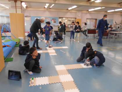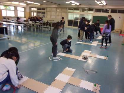 基本的な操作を身につけた後は、応用的なプログラムに挑戦しました。子供たちは、長さを測ってどれだけ進めばいいかを考えたり、車を置く位置を調整したり、試行錯誤しながら取り組んでいました。
