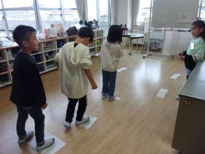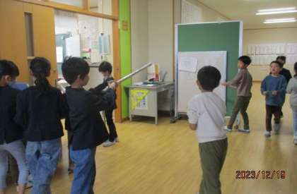 これまで各クラスでつくっていた動くおもちゃを使って、2年生みんなで遊びました。クラスで2グループに分かれ、自分のクラス以外の3クラスを順番に回りました。