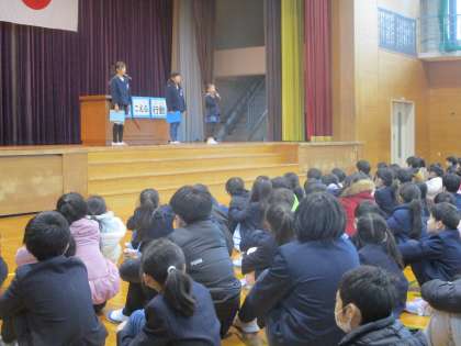 第2学期終業式がありました。校長先生からの話の際には、2学期の活動を思い浮かべながら、真剣な態度で式話を聴いていました。また、児童代表の言葉では、1年生の代表児童が「2学期にがんばったこと」を堂々と話しました。