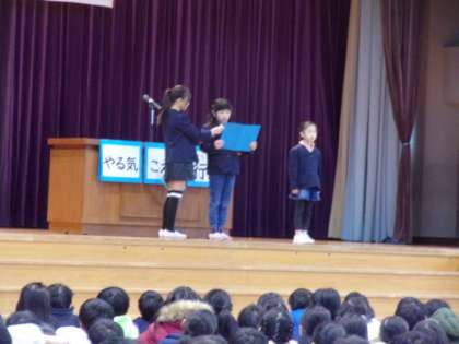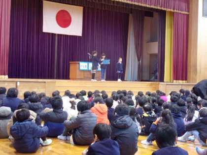 3年生の代表児童が、2学期にがんばったことを発表しました。全校児童の前で、自分が取り組んだことについて、大きな声ではきはきと話すことができました。