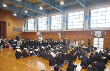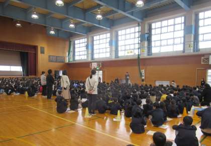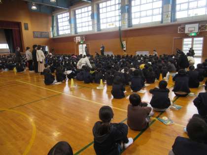 地震発生を想定した避難訓練を行いました。子供たちは、教科書やノートで頭を守りながら、落ち着いて避難していました。