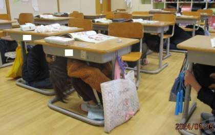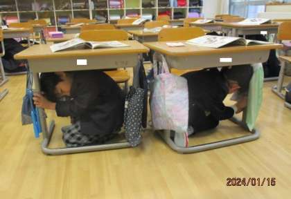 地震が起こった場合に備えて、避難訓練を行いました。姿勢を低く、頭を守って、動かないという大切な行動がとれた子供たちが多くいまし。日頃の訓練が身に付いている様子が感じられるとともに、これから自分の命を自分で守るという意識を高めていました。