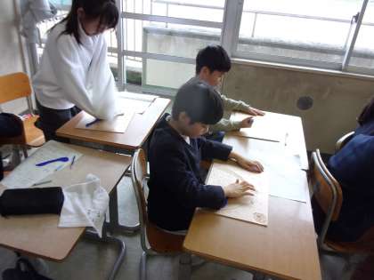 図画工作科の学習では、版画に取り組んでいます。国語科で学習した「三年とうげ」をもとに、「鵜坂にもこんな峠があったらいいな」と想像を膨らませながら、掘り進めています。