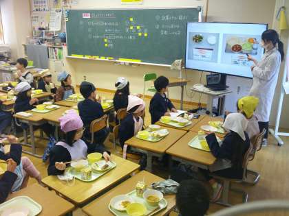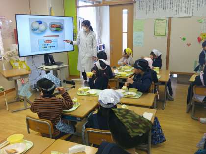 栄養教諭の先生から、毎日食べている給食についての話を聴きました。子供たちは、クイズを交えながら日本の給食の歴史を知り、「給食って大事だな」とつぶやいていました。これからも、給食を大事に食べていきたいですね。
