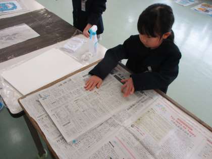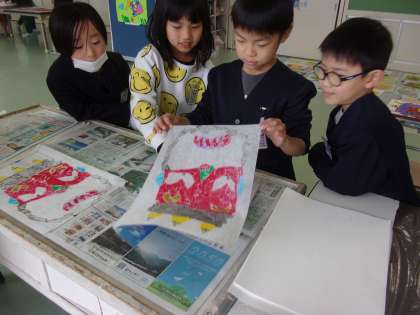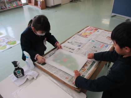 図画工作科では、版画を刷る活動に取り組みました。水で濡らした用紙をペアの友達と協力してのせたり、色がうまく写るようにばれんでこすったりしました。子供たちは、できた作品をうれしそうに眺めて、達成感を味わっていました。