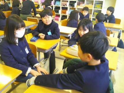 毎週金曜日の朝の時間は、トークタイムです。今日は、各学級で「この冬するならスキーかスノーボードか」「手に入るなら音楽の才能かスポーツの才能か」等のテーマを設定し、話形を意識しながら話し合いました。