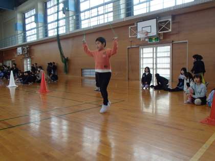 運動委員会が企画した「短なわオリンピック」に、各クラスの代表児童が出場しました。この日のために練習してきた成果を発揮しようと、最後まで諦めることなく跳び続けました。また、他のクラスの友達や2年生が跳ぶ姿を見て「新しい技に挑戦したい」という気持ちを高めていました。