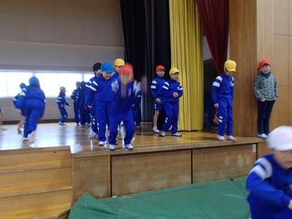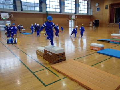 「踏み切り台の真ん中を踏んだら、高く跳べたよ」「高く遠く跳んだら、ポーズが決めやすいよ」「最初は少し怖かったけれど、どんどん楽しくなってきたよ」など、互いに声をかけ合いながら運動に取り組んでいます。