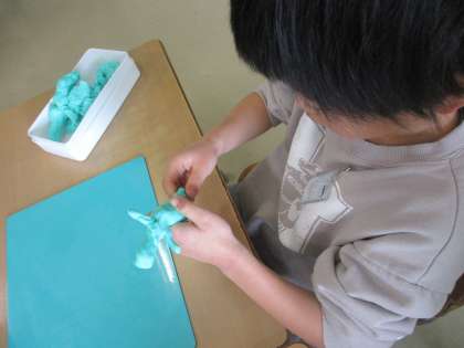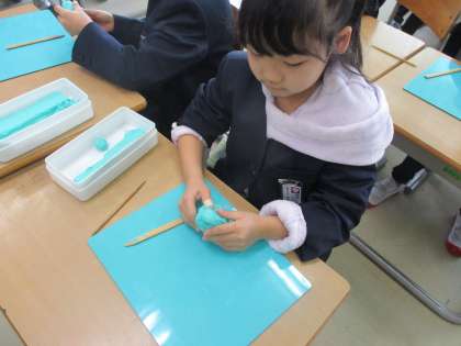 図画工作科の学習では、粘土をひねり出したりつまみ出したりすることで、自分と一緒に散歩してみたい人や動物をつくりました。表情や体の動きを工夫することで、仲良く散歩する様子を表現しました。