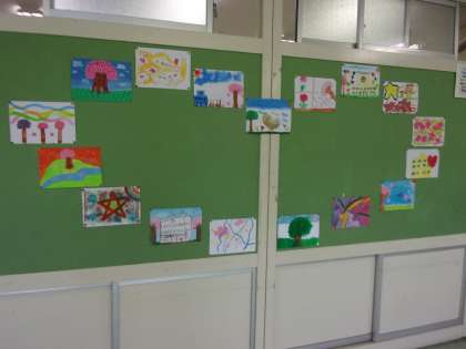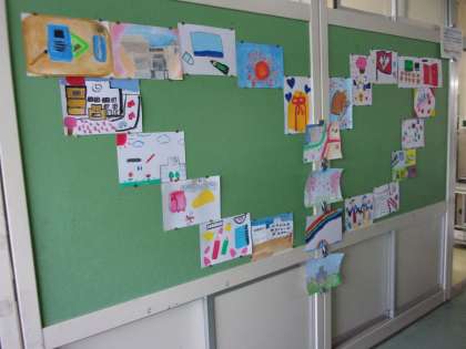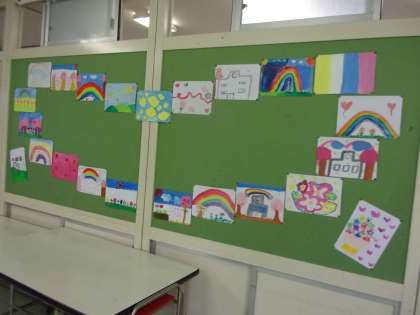 各教室の壁面に、子供たちの6年生への思いを絵で表現したものを掲示しています。作品には、感謝・忘れないでね・お祝い・さみしさといった思いを表現しています。