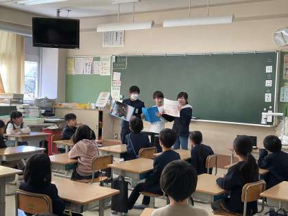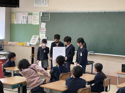 国語科では、「わたしたちの学校じまん」の学習に取り組んでいます。鵜坂小学校の大好きなところについて、グループで原稿を考えたり、資料やスライドを作ったりしてまとめました。今日は、その内容を1年生のみなさんに聞いてもらいました。一生懸命に準備をした発表内容を、1年生のみなさんが真剣に聴いていることが分かり、子供たちはとてもうれしそうでした。
