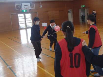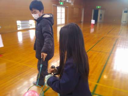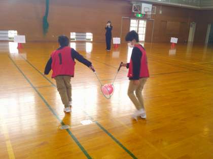 体育館では、6年生とペアになってバドミントンラケットでボールをはさみ、落とさないよう協力しながらゴールを目指しました。