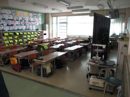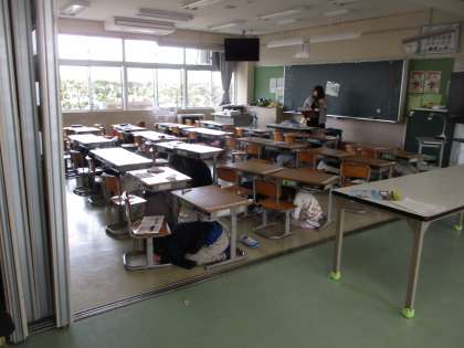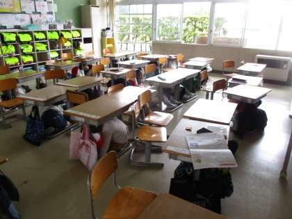 地震が発生したことを想定した避難訓練を行いました。1年生の子供たちは、避難速報が鳴るとすぐに手を止め、机の下に隠れたり、静かに放送を聞いたりして、真剣に取り組みました。