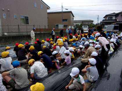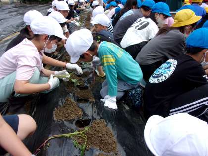 地域の栽培ボランティアのみなさんにご協力いただきながら、1年生と一緒にサツマイモの苗を植えました。6年生は、1年生に優しく声をかけながら交流をしていました。
