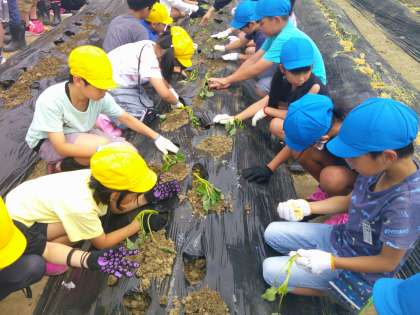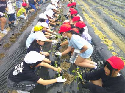 5年生といっしょに、サツマイモの苗を植えました。5年生が、2年生の子供たちにやさしく植え方を教えてくれました。水をたっぷりあげて、これからの成長を楽しみにしています。