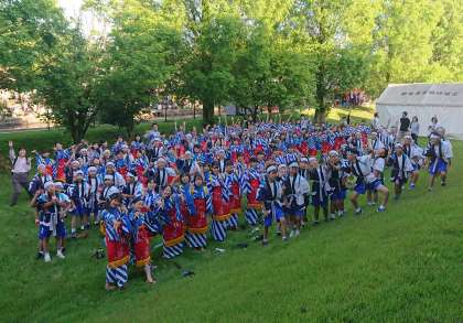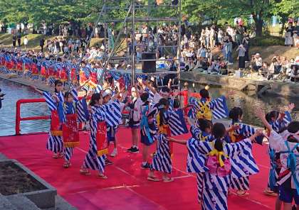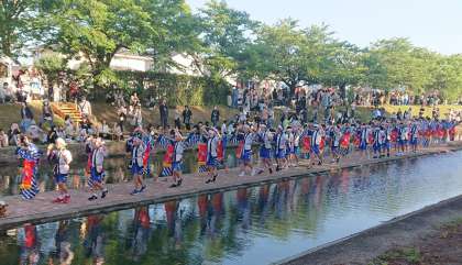 6年生は鵜飼祭りのオープニングで、さんさい踊りを披露しました。 みんな堂々と披露しました。