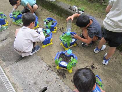 アサガオが大きく成長してきたので、さらに育つようにいちばん大きなアサガオを残して間引きをしました。子供たちは、「家で育てたい」という思いをもっていることが分かりました。間引きをしなかった子供たちは、芽を持ち帰り、育てるかどうか家族と相談することにしました。生き物を大切に思う子供たちの気持ちを、大切にしていきたいと思います。