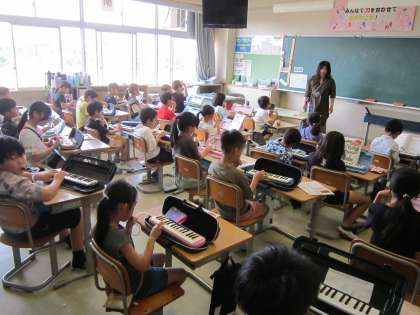 1学期も半分を過ぎ、子供たちは日々、学習にしっかりと取り組んでいます。1組は、算数科でものの長さを巻き尺で測りました。2組は、音楽科で鍵盤ハーモニカを使って合奏していました。