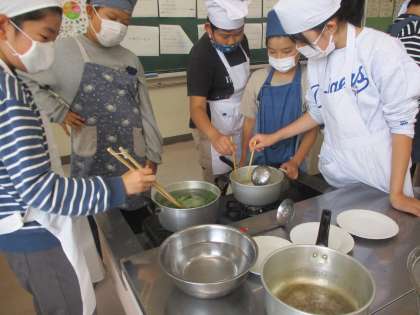家庭科の学習では、「ゆでる」の調理実習をグループで協力して行いました。
