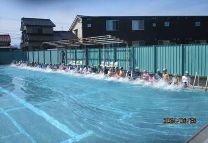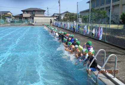 プール学習が始まりました。大プールでは、バディーを確認し合いながら、壁伝いに歩いたり、泳いだりしました。