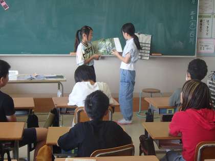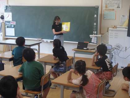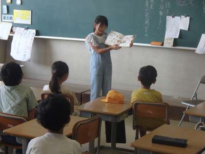 お話ワールドの時間に、図書委員会の児童が読み聞かせをしました。図書委員会の児童は、1学期中に読む絵本を選び、これまで練習を重ねてきました。読み聞かせでは、図書委員会の児童の読む話に夢中になって聴き入る姿が見られました。